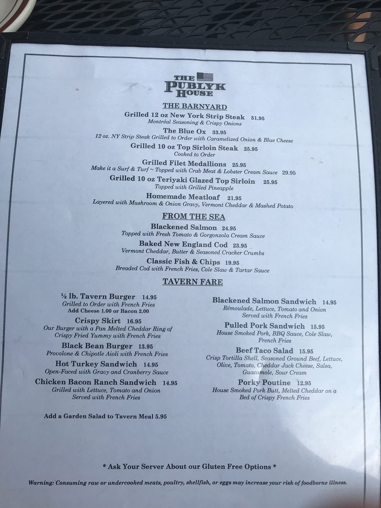 The Publyk House in Bennington, VT offers a diverse menu with New American and steakhouse options. With a focus on providing a comfortable dining experience, they offer amenities like reservations, takeout, delivery, and even catering services. The restaurant caters to various dietary needs with many vegetarian and gluten-free options available. Customers praise the delicious food, including lobster macaroni and cheese, a flavorful salad bar, and delightful gluten-free dishes like artichoke and spinach dip. The restaurant's scenic views and cozy atmosphere make it a popular choice for special occasions. While some guests highlight minor areas for improvement, overall, The Publyk House is commended for its great food, attentive service, and inviting ambiance. With a full bar offering happy hour specials, this spot is perfect for a casual meal or group gathering.